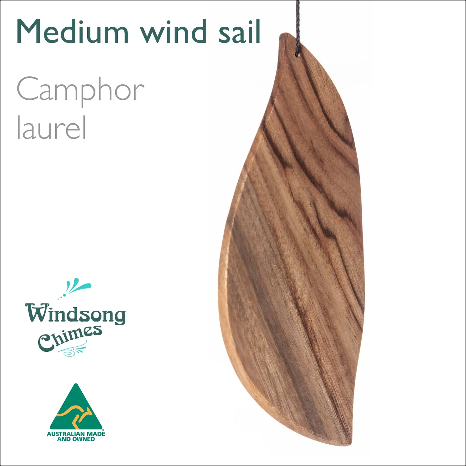 This camphor laurel sail is handcrafted into a 3D curved leaf shape, band sawn from solid blocks, ensuring it retains it's shape and catches the wind long into the future. It measures approximately 15cm x 8cm.