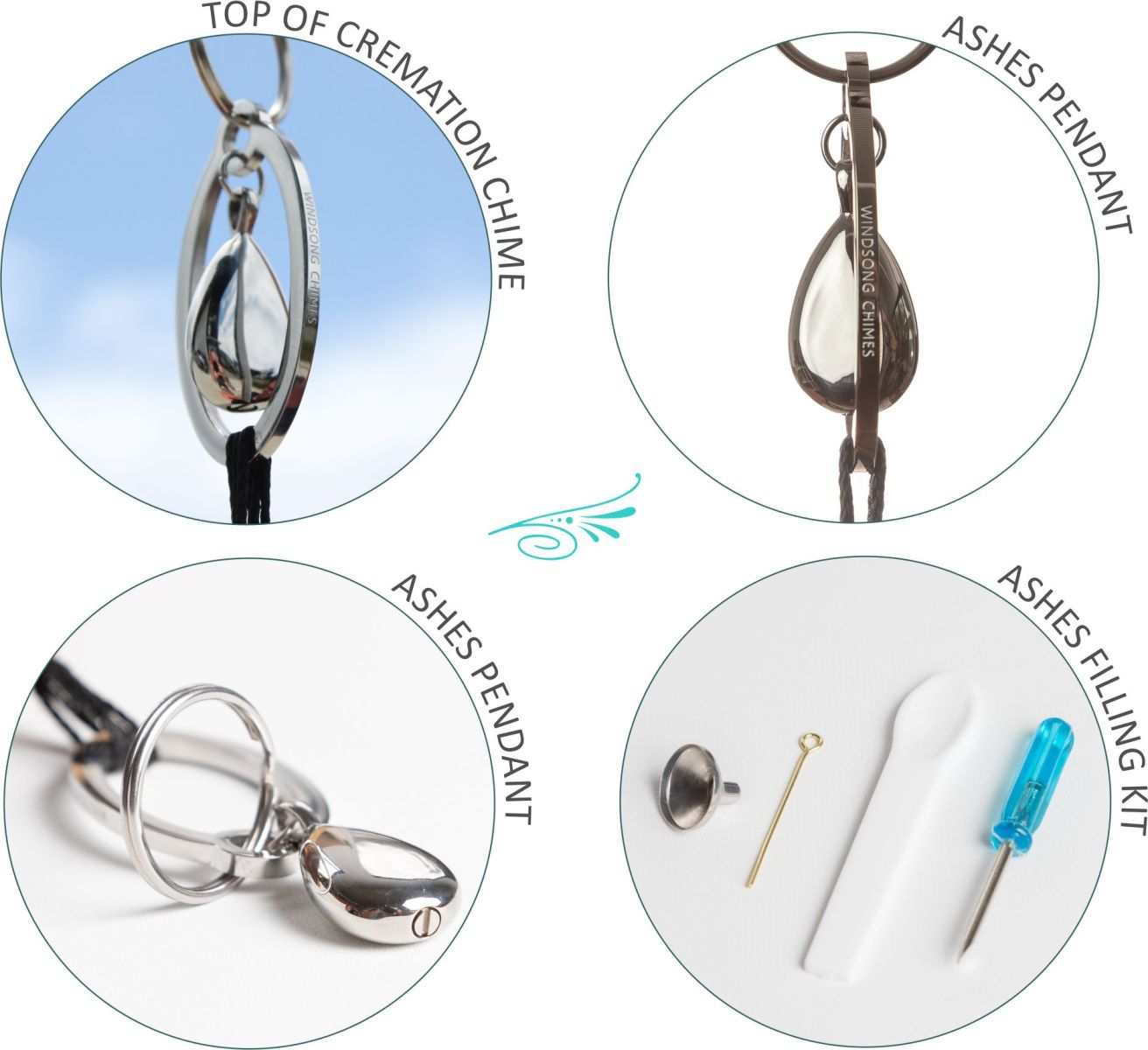 Our ready-made Cremation Ashes Willow wind chime has an integrated polished stainless steel pendant at the top of the chime. Like a very small ashes urn, it holds a nominal amount of ashes and comes with a filling kit. This cremation ashes chime is limited to the four engraving templates shown above. You can order the ashes pendant separately and have it built in to any of our larger wind chimes.