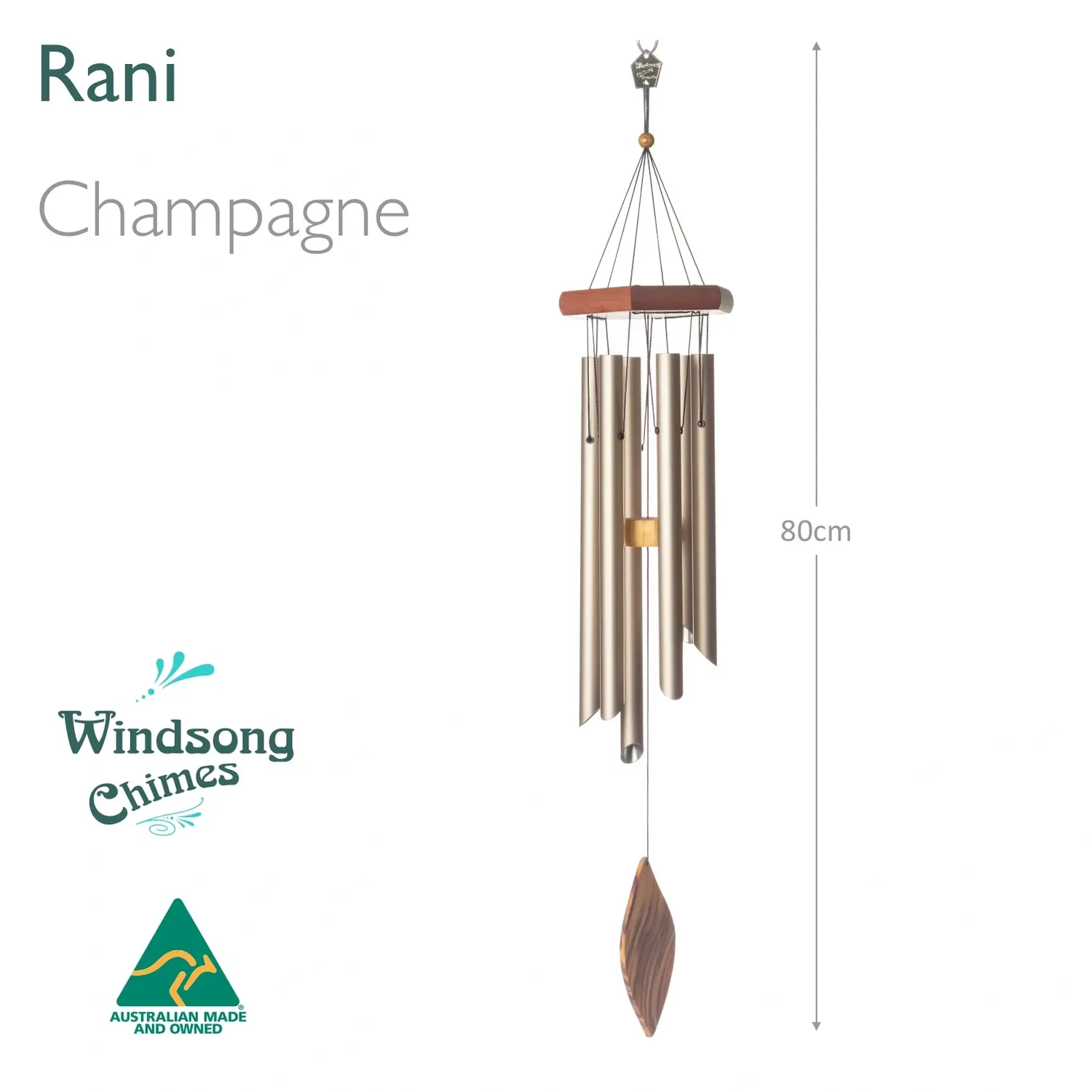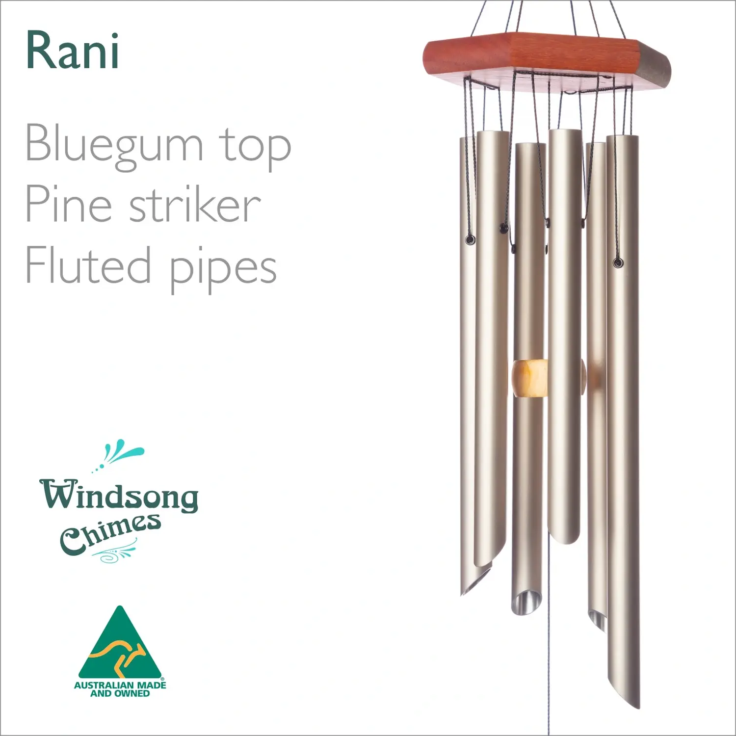 Our "Indian Princess", the Rani wind chime is tuned to an Indian musical raga with melodic structures to 'colour the mind'. The six pipes ensure good Feng Shui and this beautiful little wind chime has all the design features of our larger chimes.