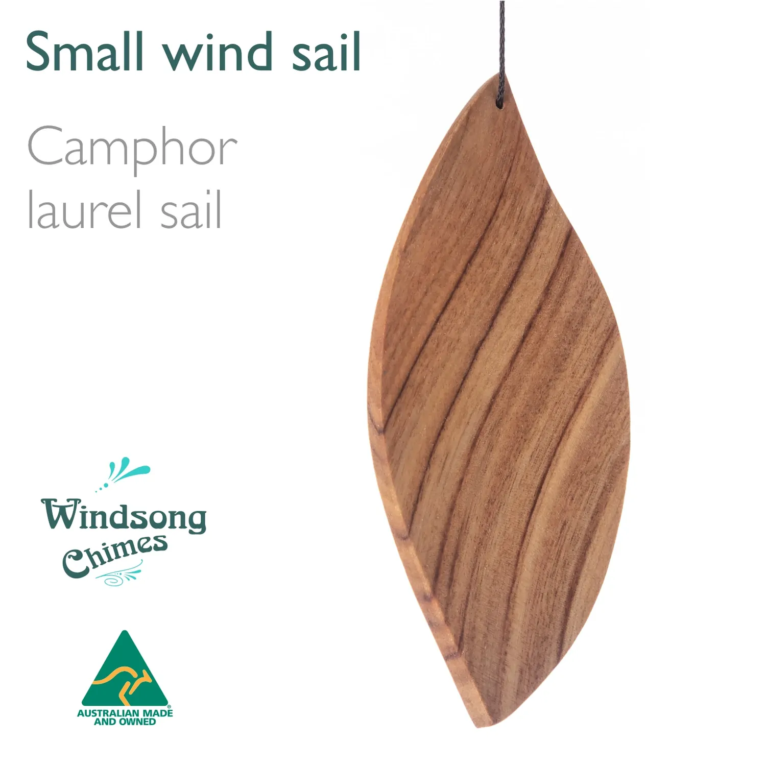 This camphor laurel sail is handcrafted into a 3D curved leaf shape, band sawn from solid blocks, ensuring it retains it's shape and catches the wind long into the future. It measures approximately 14cm x 7cm.